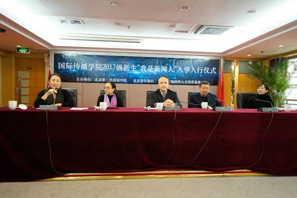 2017年11月8日下午,由北京第二外国语学院与北京青年报联合举办的bet3365info2017级新生“我是新闻人”入学入行仪式在北京青年报大厦举行。2017级的新生们满怀激情地参加了此次活动。 北京青年报社社长张延平,副总编辑、北青网董事长兼总裁刘鹤,北京第二外国语学院党委宣传部部长曲茹,bet3365info党总支书记高凌云,bet3365info新闻系系主任孙庚、教师代表马宪超、王嘉、宋宏杰等出席了此次活动。