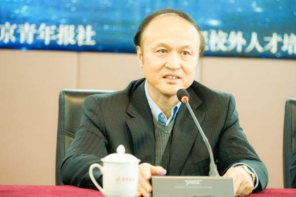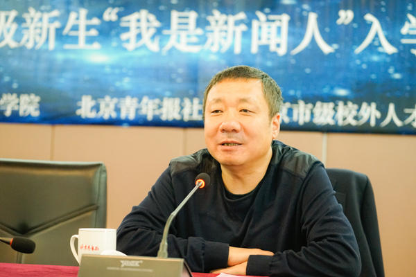 参观结束后,大家在会议室聚集,正式开始入行仪式,由高凌云老师担任仪式主持。 仪式上,首先由北青报社社长张延平讲话。张社长对时代与媒体行业的结合有着自己的特殊理解。他说,作为新闻工作者最大的意义就是它能使你把人生扩展到整个世界,这是其他行当都不能比的。他对新闻业的前景也做出了前瞻性的预估。传统大型媒体集团作为党政机关的媒体机构,具有其他互联网新媒体所不具备的优势,未来传媒的发展方向一定是一个整合趋势。张社长也表达了自己对内容和平台的理解。他说,一个优秀的采访内容必然要依靠一个优秀的平台去传播。采访内容是十分重要的,这就要求记者要有求真求实不怕吃苦的精神。他举了许多记者暗访的真实事例向同学们阐述了作为一名优秀新闻工作者的艰辛和价值。